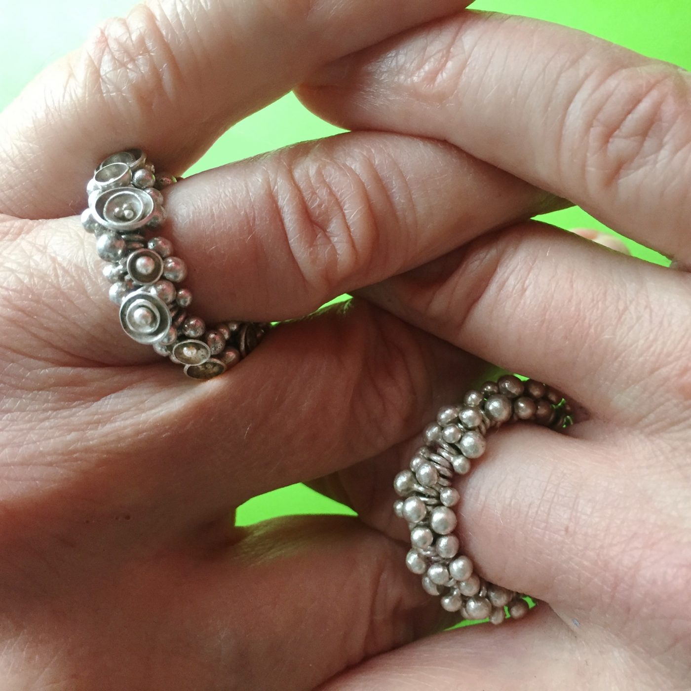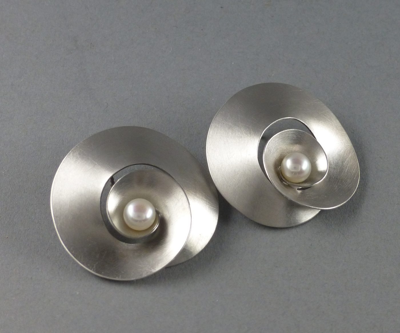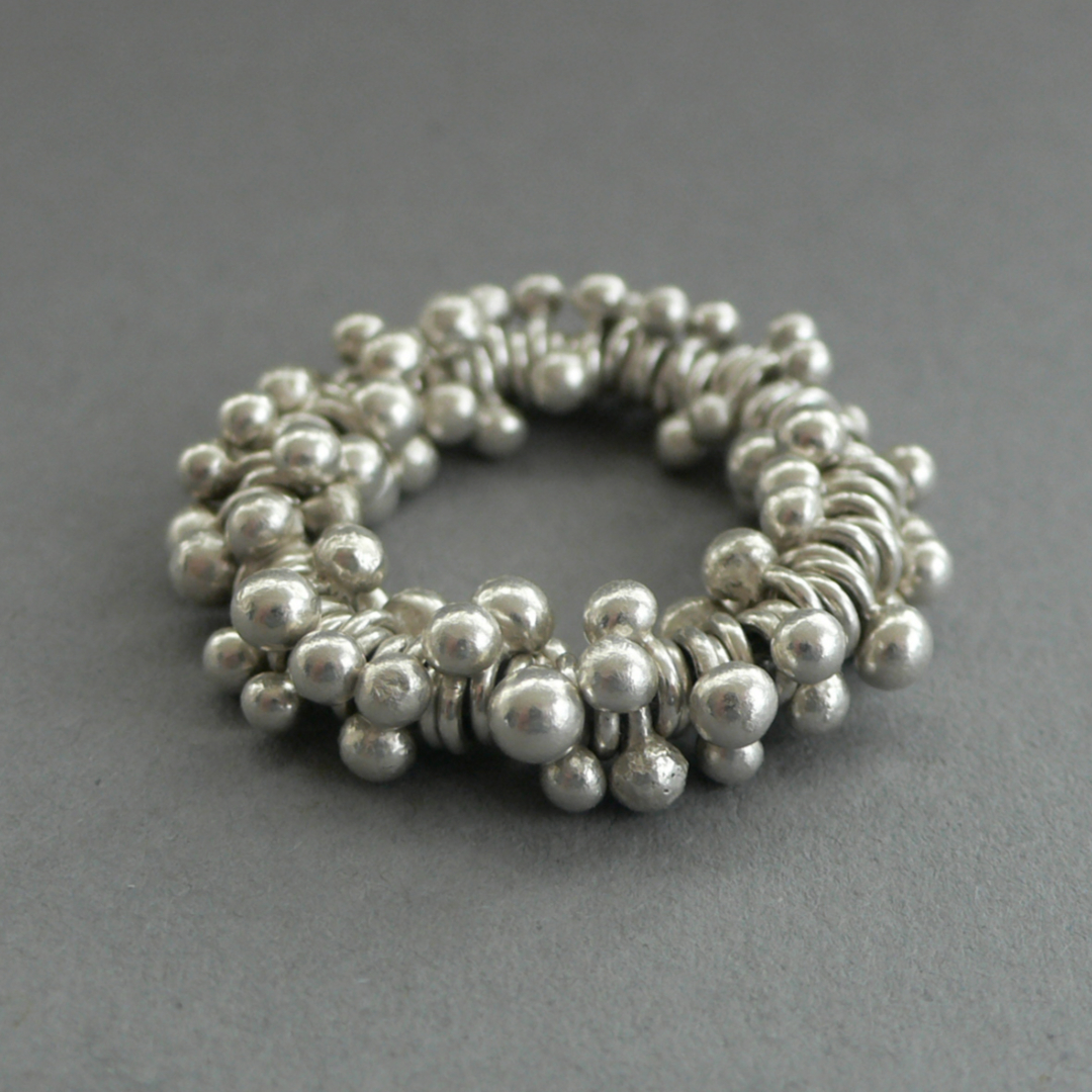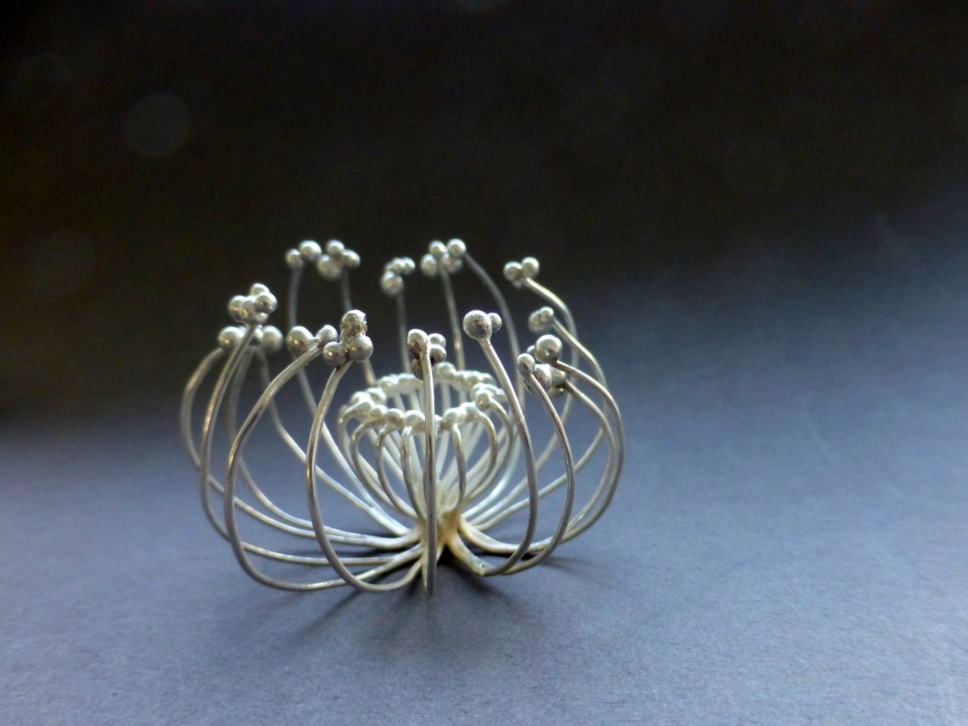 SchmuckKennzeichnend für meine Arbeiten sind organisch anmutende, weiche und klare Linien sowie Arbeiten mit spielerisch beweglichen Elementen. Flächiges Ausgangsmaterial wird durch Falzen, Biegen, Schmieden und Falten plastisch verformt zu leichten Objekten mit skulpturhaftem Charakter.
