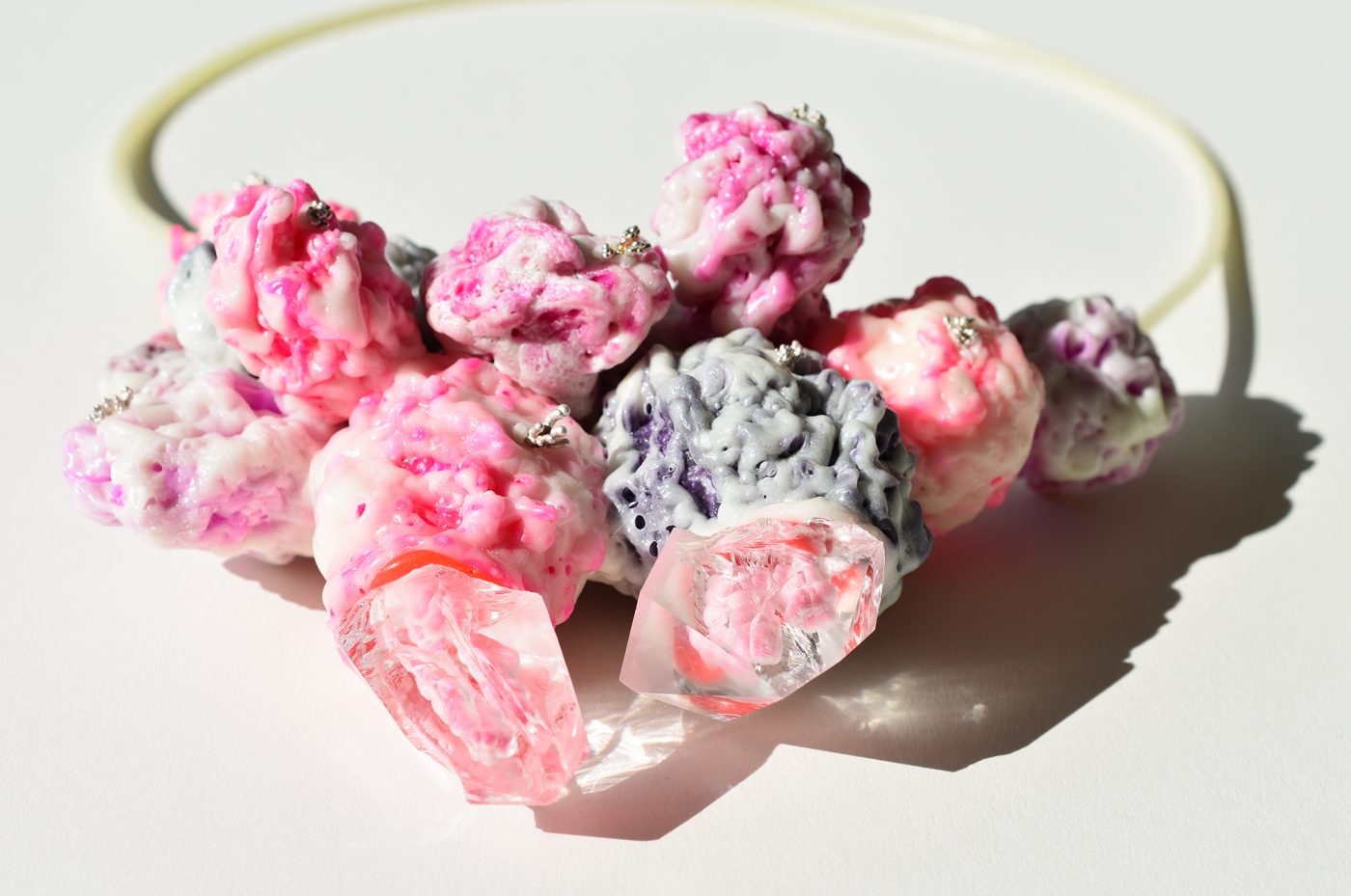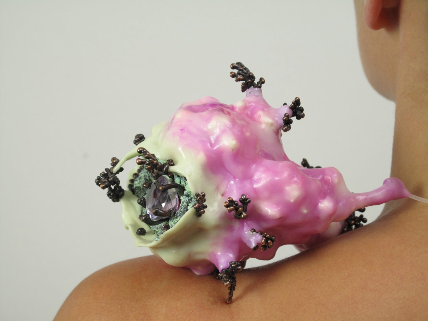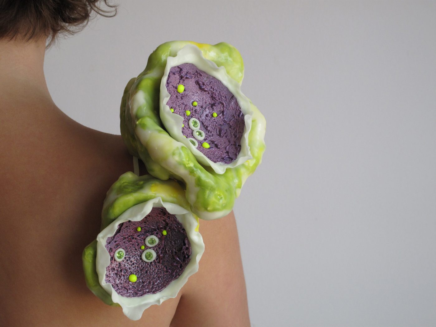 SchmuckIch gestalte grelle, außergewöhnlichen Gebilde, die sich zwischen Faszination und Abneigung bewegen. Sie ziehen Aufmerksamkeit auf sich, ihr Tragen erfordert Selbstbewusstsein und Überzeugung, konstituierte Auffassungen von Schmuck werden in Frage gestellt.